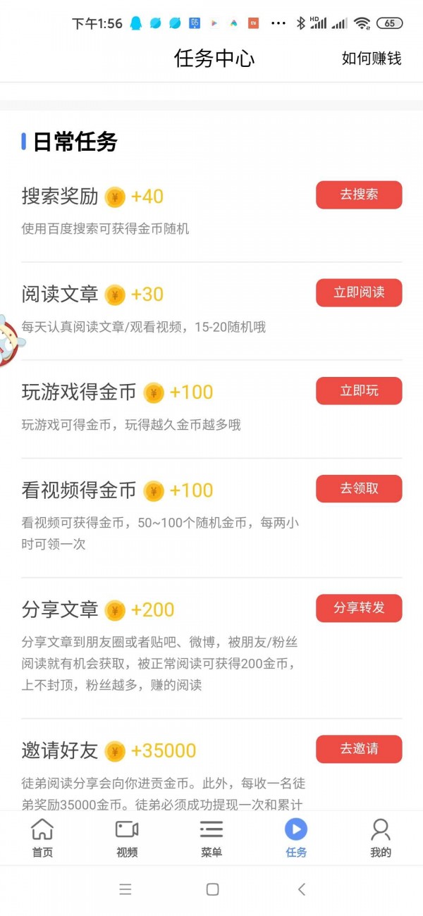 4、阅读奖励--阅读文 章时长足够的情况下可以点击文章中右下角里的红包进行领取,获得10-30不等的金币。