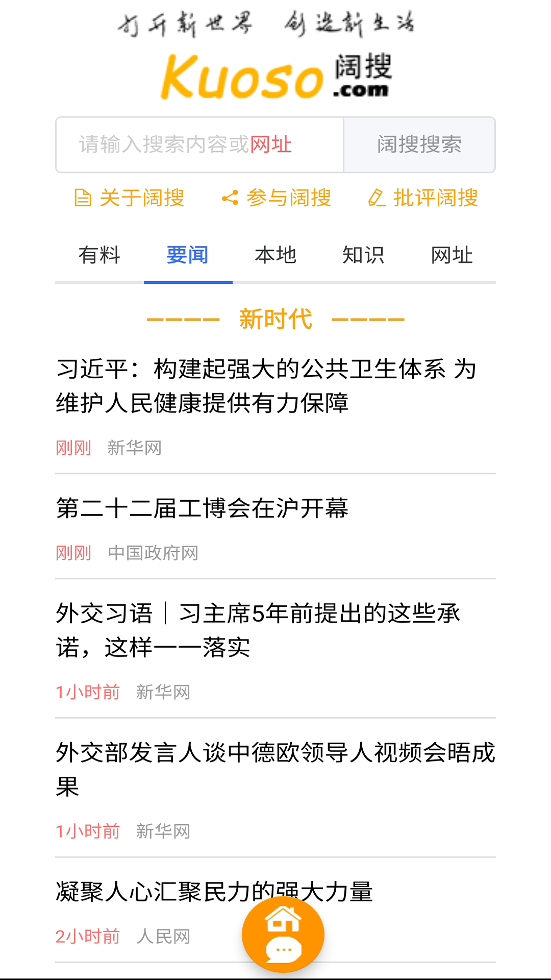 本APP是一款集搜索、新闻浏览及交友讨论的综合服务软件, 可为用户提供更加及时的国内外新闻热点及文娱资讯, 浏览信息的同时, 您可以对感兴趣的话题评论、交友、分享, 使您能结交更多拥有共同兴趣爱好的好友、 愿该软件成为您了解实时新闻、结交好友的利器。 搜索内容无广告。