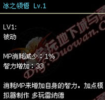 冰之领悟,等级:16[必满技能之一, 直接显示在面板的智力很是给力。]