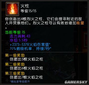 这个技能没得好说,神技必点。但是请注意,大多数人会头脑发热的把15点毫无保留的献给它。但实际上,经过计算和测试,加10点便已经可以达到火柱一次性或几乎一次性充能的效果,再多的点数,只能是浪费。慎重,慎重。。。