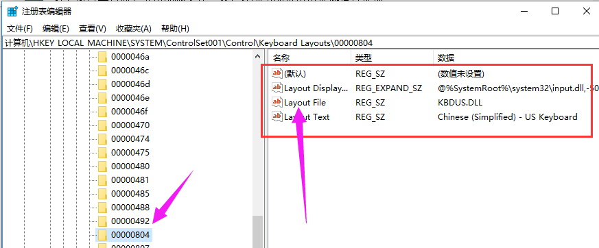 打开注册表,在弹出的注册表编辑器上找到“HKEY_LOCAL_MACHINE SYSTEMControlSet001ControlKeyboard Layouts”仔细检查会发现以“0804”结尾的都是简体中文输入法。