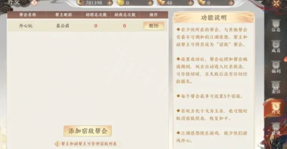 帮主和副帮主,可以确认自己帮会与其他帮会的关系,无需对方同意,最多可以设置5个宿敌。