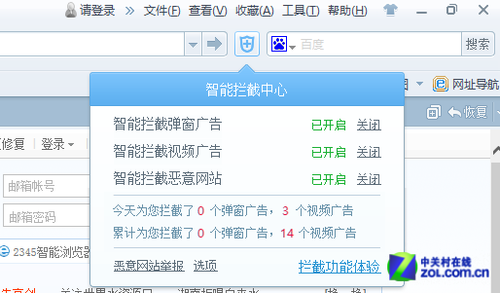 事实上除了广告屏蔽,2345浏览器的智能拦截中心还有更多的功能,可以拦截更多的内容,包括恶意网站、ActivX控件、Flash、运行脚本等等。当然如果你不想拦截某个网站的广告,则可以将网址填在白名单中。