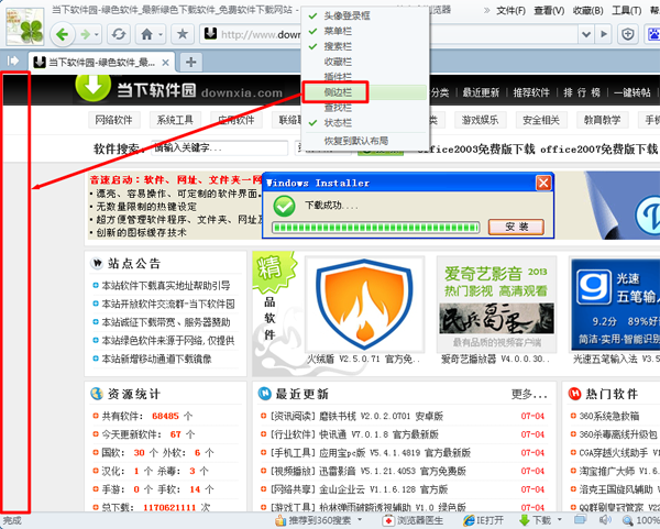2、侧边栏隐藏:右击浏览器最上方的空白处,在出现的下拉菜单中选择“侧边栏”,去掉前面的勾即可。