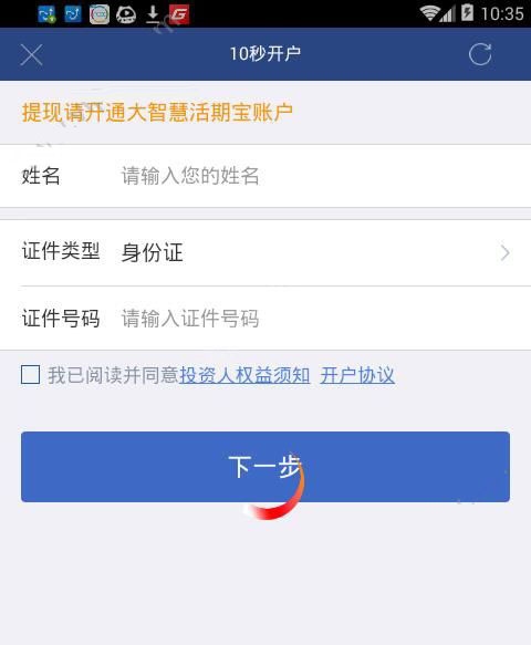 3、接着你需要开通大智慧活期宝账户,输入自己的姓名、证件号码等资料,仅需10秒就能开户成功,接着就可以提现成功了哟!