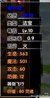 法宝技能:  【飞剑】御剑飞行  飞剑可以进行攻击【就1滴血!】不是来杀怪的,踩在上面后停止不动 木:持续20秒 其他:持续10秒