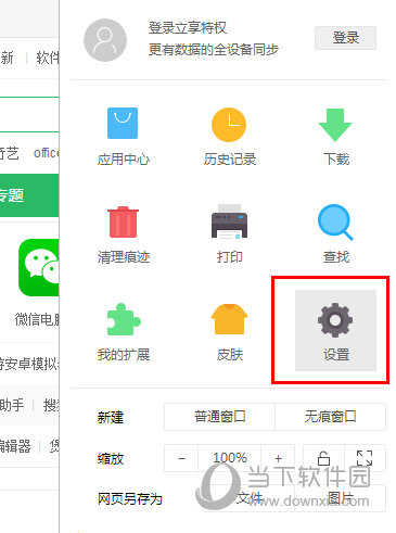 1、在打开的浏览器界面,点击右上角的“菜单图标”按钮。在弹出的菜单选项中,点击“设置”命令选项按钮。