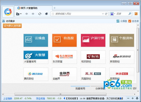 大智慧金融浏览器是大智慧官网最新发布的一款网页浏览器,该浏览器结合了普通浏览器与金融软件的功能,能够帮助你了解金融的行情。是一个能看盘的浏览器,在浏览网页的同时,不耽误投资理财。