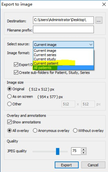 3.下图标黄栏选择“当前图像”、“当前系列”、“当前患者”、“所有患者”等,这就是批量转换的重点步骤。