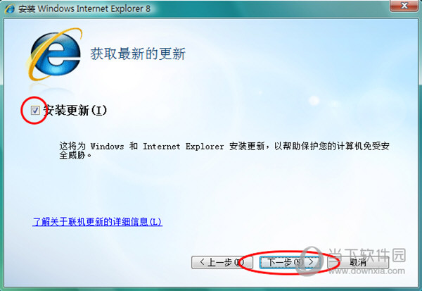2、请直接在上方界面选择【下一步】进入到ie8浏览器(Internet Explorer 8)安装更新界面,如果你需要更新ie8浏览器的版本请勾选图中选项并继续【下一步】。