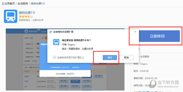 3、安装扩展应用,安装好后在浏览器的右上角会出现搜狗抢票的扩展应用。
